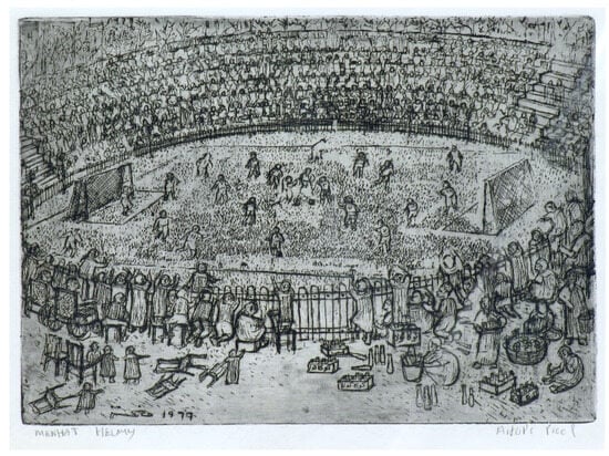Stylistically and thematically, the bulk of Menhat’s etchings are set in urban Cairo, and perhaps recall the figural gestures of L.S. Lowry’s social scenes of the urban working class industrial areas of northern England. Lowry had connections with the Slade where he had once been a tutor in painting. Although we lack evidence of any direct knowledge or connection with each other’s art, we can reasonably assume that Helmy was well aware of Lowry’s approach to painting scenes of the working class on streets and public spaces of Manchester (Thompson 2013). At the time of Helmy’s admission into the Slade School of Art, Lowry’s reputation had grown to such an extent that he was made the official artist of the new Queen’s coronation in 1952. A direct comparison may be made between Lowry’s 1949 painting The Football Match, with its bird’s-eye perspective (BBC News 2011), the 1953 painting Going to the Match, and Helmy’s own 1966 etching Football Stadium, of a Cairo football grounds and spectators. If Lowry’s painting was shown soon after its completion, it is possible that Helmy, who had just entered Slade would have known of it. In both painting and etching attention is given to the exterior of the stadium, its surroundings and activities of spectators outside the grounds. In Lowry’s Going to the Match, only a glimpse of one grandstand is seen, and emphasis is instead given to the fans forming files of lines to enter the stadium, Helmy gives a bird’s eye view of the stadium, a passing reference to Lowry’s earlier painting. This allows the viewer to gaze down into the rows of seats for the paying spectators and the full gamut of both teams facing off at midfield. One assumes there is a difference in status or choice between the paying customers inside the stadium and the preference of those looking on over the fence from outside. It is this outside cluster of fans that includes what appear to be women and children, and some bottle vendors or discarded bottles from picnickers or spectators remaining outside the grounds.