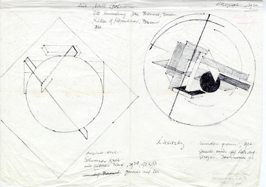 One of the people Jean Leering wrote to was Hans Klihm, a gallery owner in Munich. Leering asked him to look around for works by Lissitzky on the market. And it was this gallerist who discovered a private collection with a lot of early works by Lissitzky in Stuttgart4. It was owned by Ilse Vordemberge-Leda, the widow of the painter Friedrich Vordemberge-Gildewart. He had taken over Lissitzky’s temporary studio in the Kestner-Gesellschaft in Hanover in 1924 after a seriously ill Lissitzky left the city at the end of 1923 for an extended period of convalescence in Switzerland. In this studio, Vordemberge-Gildewart found a portfolio with works on paper by Lissitzky. We do not know whether Lissitzky actually gave these works to Vordemberge-Gildewart, but as far as we know, he never asked for them back.