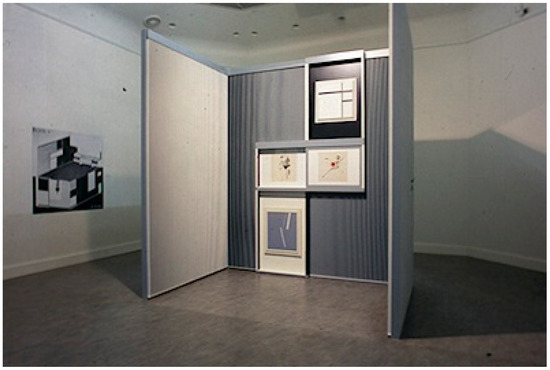 For this major retrospective, part of another of Lissitzky’s demonstration rooms was reconstructed: the ‘Abstract Cabinet’. Lissitzky designed this room in 1927 for Alexander Dörner, then director of the Provincial Museum in Hanover. Dedicated to the presentation of contemporary art, this exhibition room also had its own artistic value. The original was destroyed by the Nazis in 1937 and the museum in Hanover made its first reconstruction in 1968, followed by several other versions18. The reconstruction in the Van Abbemuseum consisted of two of the walls of this room, both with the black and white slats that formed a dynamic background for the paintings exhibited on them. One of the walls had the slideable panels in which graphic works could be shown (Figure 11).