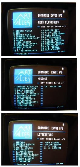 Art with videotext has existed in various countries (notably Canada and Brazil) but it is in France that it has developed the most (). With the widespread deployment of the Minitel throughout the country, some artists saw the possibility of reaching a new public directly from their homes. In 1985, this was also the argument put forward by Frédéric Develay and ORLAN in their choice to use this new medium as a creative platform: “France is one of the most advanced countries in the field of telematics, especially if we consider the number of Minitel terminals currently distributed: more than 1 million, and soon many more (it is announced that there will be 2 million by the end of 1985)” (). They thought they could potentially reach more than two million “readers”, or even more with the growing number of households equipping themselves with a terminal during the 1980s. These two artists, interested in new technologies, decided to create in 1984 “the first telematic magazine of contemporary art” (). The magazine was divided into three sections: the first—and by far the most important—was devoted to “Visual Arts”, the second to “Literature” and the third to “Music” (See Figure 1). The art critic Annick Bureaud analyses: