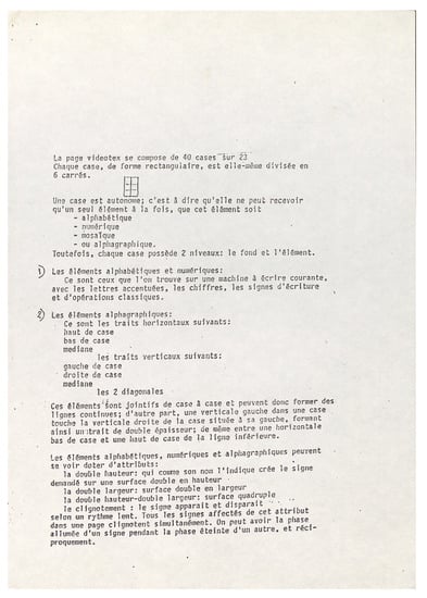 It should be noted that if the contributors received a paper model of the screen grid in addition to the written instructions, it was because most of them, and in particular the foreign artists, sent their proposal by mail and thus drew on paper the succession of the screen pages of their project. In the vast majority of cases, the artists who participated in this magazine were not familiar with videotex technology and were unable to program the screen pages of their project themselves. The use of a technician was therefore essential. The technician tried to interpret the drawings sent by the artists and to adapt them to the constraints of the screen and the Minitel technology. When possible, the artists worked directly with him to create the screen pages of their project together (See Figure 3).