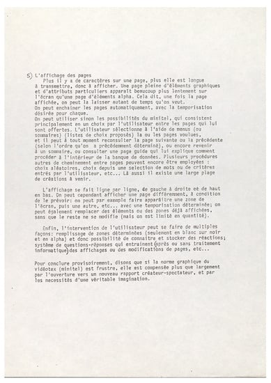 The aim of the magazine was to propose original works “absolutely without concession [and] without thinking about the general public” () on one or more pages specially designed for the Minitel and to be seen in this context. Although the magazine’s creators were demanding with regard to the artists’ proposals, these were accompanied by a mediation to allow a better understanding. Before the work, the reader had access to a text written by the artist himself on one or more screen pages explaining his approach, how and why he has decided to create a work for the Minitel. After the work itself, another text, this time entrusted to an art critic chosen by the artist, presented the latter’s work in greater detail. Users accessed these different pages by pressing the “next” key on the Minitel terminal keyboard. ORLAN explained in 1987: “We made two bets: both the bet to make works that were not for the general public and the bet to put a lot of text and a lot of images in this Minitel, which is an open tap and in which until now there has been very little cultural relevance apart from this great thing called messaging” ().