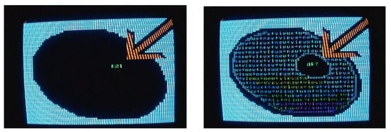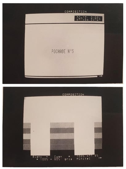 The artist Daniel Buren, famous for his black and white stripes, has also been able to adapt and play with the constraints of the Minitel. In Pochade no. 5 (See Figure 4), the only contribution without an accompanying text, the screen was initially completely black, allowing the artist’s stripes to appear over the pages, before becoming completely black again and then giving way to a variation of squares of black and white lines and stripes. In the following screens, the artist played with the different levels of grey that the transition from colour to black and white brought to the screen. Thus, the white of his stripes was transformed into a gradation of grey in a series of screens. The indications below the image, such as “White + cyan = 100% + 77.8% = 100% + 80% Minitel grey”, allowed readers to become aware of the programming carried out on the composition keyboard to achieve the result they were looking at.