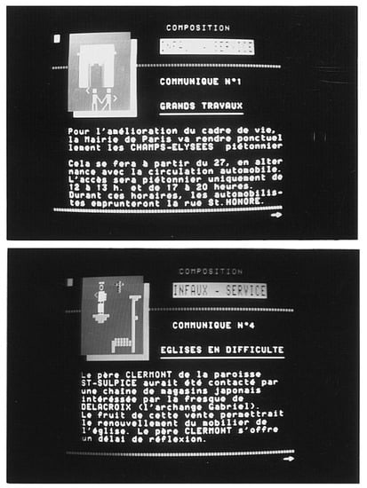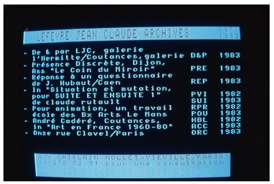 - Anis, Jacques, and Jean-Louis Lebrave, eds. 1987. Débats Sur Le Vidéotex. Linx no. 17 “Le texte et l’ordinateur”. , 71–75. Available online: www.persee.fr/doc/linx_0246-8743_1987_num_17_1_1077 (accessed on 30 October 2022).