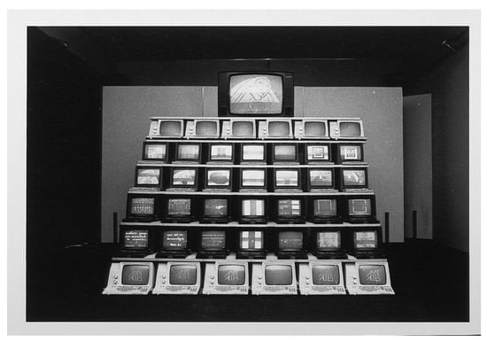 In addition to being directly accessible from home on any Minitel terminal using the code 3615 AL33,13 the magazine was regularly shown at exhibitions and artistic events during its existence. Its presentations have taken several forms. During the exhibition Les Immatériaux at the Centre Pompidou, the magazine was available on a single Minitel terminal among others in the site Labyrinthe du langage, which brought together numerous artistic projects on Minitel and computer terminals.14 The same year, at the Locarno International Video Art Festival,15 the magazine was presented in the form of an installation made up of forty Minitel terminals of various models topped by a television set retransmitting the image of ORLAN’s Madonna (See Figure 10). Each terminal was switched on and showed a creation by one of the magazine’s artists. This was made possible by one of the possibilities offered by the Minitel terminal: “by making two quick CONNECTION/END, you can keep a small work by Buren or John Cage as a luminous painting for five minutes or fifteen years” (), explained ORLAN in 1987. It was the Minitel as a screen and electronic board that was highlighted in this type of presentation, not the telecommunications network. The sculptural aspect was favoured over the navigation between the projects and the numerous screen pages.16 At the FIAC (International Contemporary Art Fair of Paris) in 1985,17 the magazine was also presented as an installation with 18 Minitel terminals displayed in rows of three on a shelf, while a terminal allowed the public to consult the magazine freely (See Figure 11).