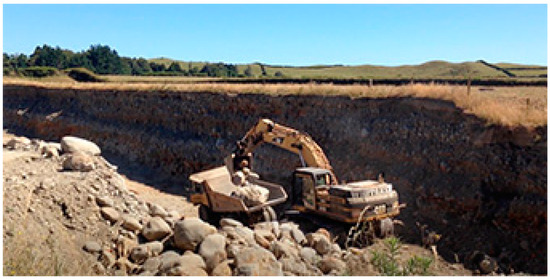 Just north of New Plymouth, one finds several quarries which were all contracted to harvest, transport and spread the boulders of the coastal walkway. An imaginary hum of diesel engines and a trail of muddy truck tire tracks lead to Jones, very likely your previous resting place (Jones Quarry n.d.) (Figure 1). There, along the edge of the Mangaoraka Stream, a stream snaking through the alluvial soil, to the sea, to the sea, your aunties, cousins, and uncles lodge in a tight matrix blanketed with layers of alluvial soil topped by native grasses. Buried together as deep banks, your ancestors are sleeping, like you did until the jaws of a digger cut a vivisection to this bedding, yanking drowsy toka, stones, dismantling embraces and disturbing dreams. A geological columbarium disinterred.