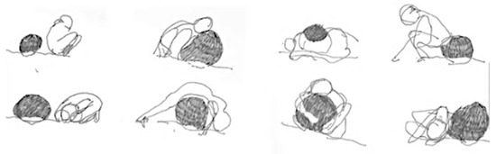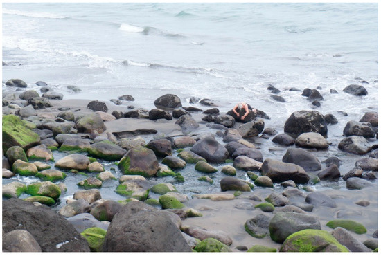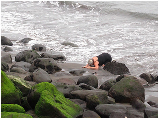 In my head, I am crouching into a tight ball, the smallest volume this plump body can muster. Knee-hugging, back hunching, head burying, every fibre of my being is teaming to emulate you as a stubborn statue. I meditate on geological processes based on compression—all stress is directed to the centre, squeezing, folding internally, on the verge of fracturing, bending, or crumbling (The Geological Society n.d.). Exhausting all airspace, all surfaces in full contact of one another, moving in slow time, the rock of ages, poised in petrification. I am determined to be still for as long as possible, eyes shut, consumed by interiority, to assume an empathetic posture, in silence, to blend in, endure the pain, pass the time, which escapes measure other than the countless waves that test my resolve. My tailbone is pressing into the hard curve of your exterior; it provides leverage. A tingling sensation, spinal energy, plugged into your liveness. Far from abstract or conceptual, this is a sensuous mimesis; a human body co-mingling with its environment; a human body foiling the historical trap of figure-ground, escaping the ‘world-picture’ that makes humans the master of that world (Levin 2014, pp. 7–8). Practicing geo-mimicry (Figure 3).