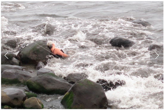 The next wave bowls me over. The world spins. This human-stone unfurls to expose its soft underbelly interior; the ruse is up. And the top to my togs is down. Flashes of blinding whiteness. Voices are shouting and showering worry, concern, and alarm towards me, now a bundle of appendages flailing in the surf (Figure 4).