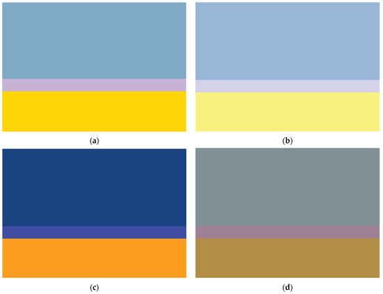 As for the preeminently important “intermediary” colors, their lightness noticeably correlates with the background colors, but in almost all charts they are significantly lighter than the latter (Figure 14). Among the intermediary colors in the Reference Book, fairly light blues and purples (Table 3) with low to medium chroma predominate (Figure 9). However, Matyushin aims to demonstrate that the same combination of main and environmental background colors can be harmonized by a linking color in several different ways, rather than one in particular. The choice depends on the practical task because, according to Matyushin’s deepest conviction, the intermediary color can diametrically change the overall impression produced by a color combination as follows: the intermediary color can enhance or reduce contrast, create depth, or add transparency, making the composition calm and comfortable or, conversely, active and stimulating (cf. Figure 12 and Figure 13).