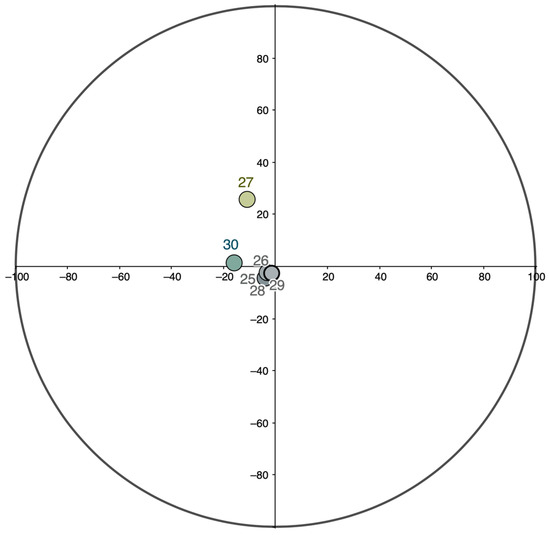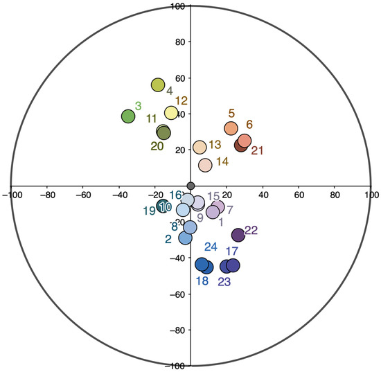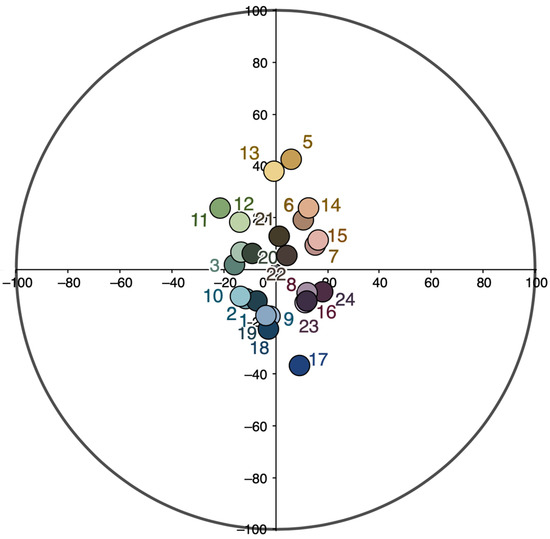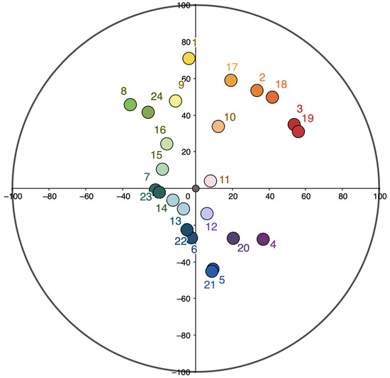 In Section IV (Figure 16), the colors of all three groups (the main, “intermediary,” and background colors) are located much closer to each other on the color circle than the colors of the other sections (Figure 15). Meanwhile, the pattern revealed for the other sections remains as follows: the difference between the background and intermediary colors in almost all the charts is less than that between the main active and intermediary colors.