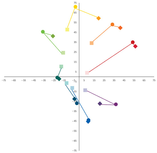 In order to further analyze the “geometric” properties of the color triads plotted in CIELAB color space, we computed the color differences between the vertices of each triangle according to the CIEDE2000 Formula (1) and used them as a measurement of length for each side of the triangles (Table S1, Figure 17).