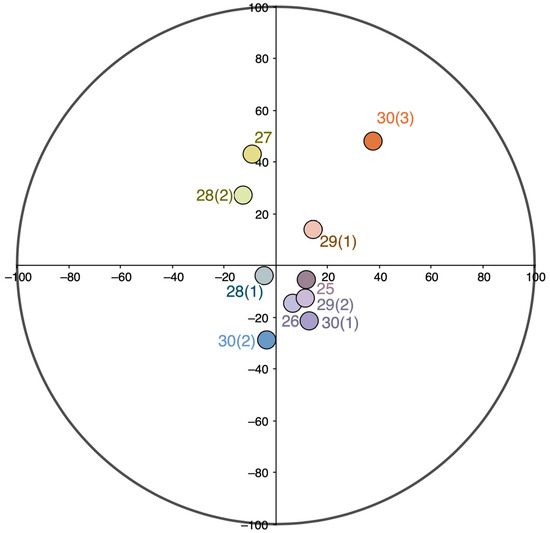 The 10 color charts in Section IV include only five main colors (Table 1, Figure 6). All these colors represent different lightnesses (34.47 ≤ L ≤ 86.78) of red-brown shades with low chromaticity (8.93 ≤ C ≤ 36.92), three of which (charts 25, 27, and 28) almost completely coincide in hue (84.28 ≤ h° ≤ 85.39), while two others (charts 26 and 30) fall within the color circle’s 30-degree arc between red and yellow (44.73 ≤ h° ≤ 77.74).