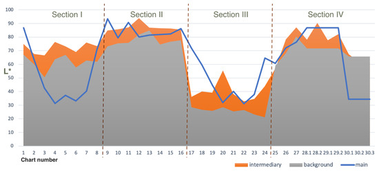 In all color triads, with the exception of only three charts from Section IV (charts 25, 30-2, and 30-3), the intermediary color was lighter than the background color (on average, these values differed by 10.88 ± 5.27) and significantly correlated with the background (b) color in lightness (r = 0.95, p < 0.0001). A weaker but also significant correlation was found between the lightness of the main (m) and intermediary (i) colors (r = 0.61, p = 0.0001) (Figure 14).
