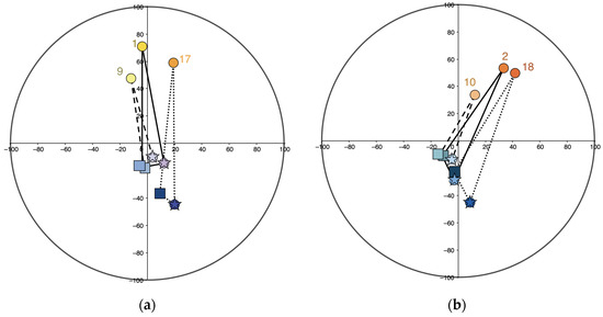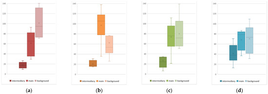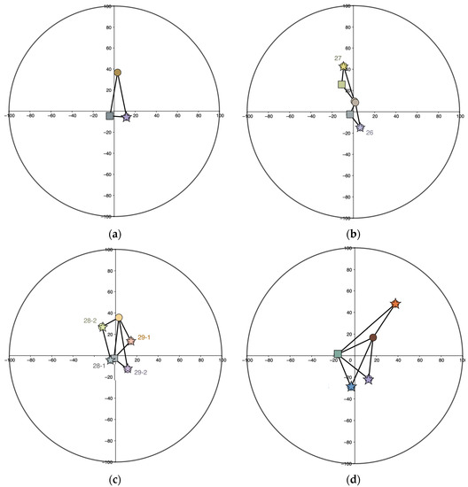 Hue (h°) and chroma (C) of the main (circle), background (square) and “intermediary” (star) colors in Section IV; projection into the CIELCh color circle: (a) Chart 25; (b) Charts 26 and 27; (c) Charts 28 and 29; (d) Chart 30.