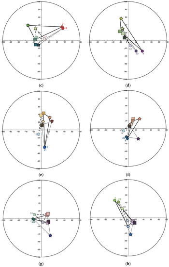 Hue (h°) and chroma (C) of the main (circle), background (square), and “intermediary” (star) colors in Sections I (unbroken line), II (dash line), and III (dotted line); projection into the CIELCh color circle: (a) Charts 1, 9, and 17; (b) Charts 2, 10, and 18; (c) Charts 3, 11, and 19; (d) Charts 4, 12, and 20; (e) Charts 5, 13, and 21; (f) Charts 6, 14, and 22; (g) Charts 7, 15, and 23; (h) Charts 8, 16, and 24.