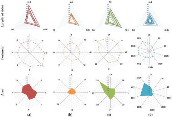 Color differences CIEDE2000 between the main and “intermediary” (m–i), main and background (m–b), background and “intermediary” (b–i) colors in Sections I (a), II (b), III (c), and IV (d). Perimeters and areas of the triangles in the Sections I (a), II (b), III (c), and IV (d).