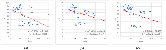 Correlation between the area of the triangle in CIELAB color space and the lightness (L) (a) of the main (m), (b) “intermediary” (i), and (c) background (b) colors.