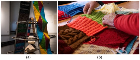 Rujum—the desert way marker traditionally made of piled-up stones, as a practical and symbolic object which became a minimalist sculpture, in the form of a pyramid-shaped metal grid draped in colorful knitted surfaces, created by the women of Arad and the nearby Bedouin settlements. The participatory knitting action was based on a series of colored palettes conceived by the art collective, matching the different countries of origin of the various women, and selected by personal preference according to their traditional cultural style (