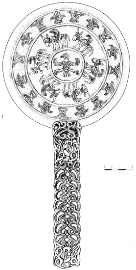 Sometimes the signs of different sorts of contacts reflect in the objects of mixed character with heterogeneous parts joined, sometimes new hybrid forms arose under the influences. For example, I refer to a mirror from Grave 2 in kurgan1 of Filippovka I burial ground (Figure 1) (Okorokov and Perevodchikova 2020, p. 41, Figure 7:1). Stylistic features of the piece of art, as well as in some other objects from this grave show mixed nature and there is no doubt that the things were made of heterogeneous details. These details show features of different cultural and technological traditions. This evidence sets suppose, that the disk of a silver mirror was made in a workshop of Achaemenid Iran, but its handle belonged to nomadic tradition. So, some pieces of art had a hybrid nature and were produced by artisans of different cultural origins. This fact could be explained by the exchange of things and following using some imported details for the creation of hybrid objects. Quite possibly, jewelry workshops were located not only in the territory of the Achaemenid Empire, but also in the neighbouring periphery, and nomadic artisans could participate in the jewelry production together with goldsmiths of varied origins. Such workshops united artisans of different origins and served not only as production centers, but also as cultural centers and at the same time as professional and artistic schools. Just these centers were the points of formation and development of Animal Style.
