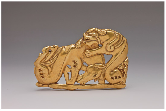 It cannot be denied that images of monsters are also typical in the Iranian culture of Achaemenid Persia. Yet we should keep in mind that the civilization of the Ancient Near East had many various sources, which caused the complicated history of this region. Furthermore, we should keep in mind that the artistic culture of Achaemenid Iran, in turn, imbibed different traditions of Near East civilization including Assyrian culture. There is an evident similarity in composition between the monster’s figure with a curved body in the relief from the Temple of Ninutra at Nimrud of Assurnasirpal (883–859) (British Museum, Korolkova 2020, p. 221, Figure 6) and the fantastic winged and horned beast of prey in the golden belt plaques from the Siberian Collection in the scene of tormenting a recumbent horse (Figure 2).
