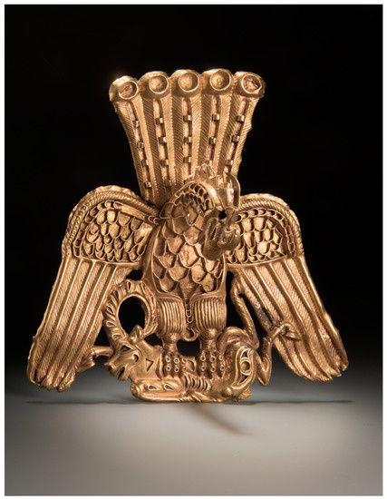 - Rudenko, Sergei I. 1958. The Mythological Eagle, the Gryphon, and the Wolf in the Art of Northern Nomads. Artibus Asiae 21: 101–22. [Google Scholar] [CrossRef]