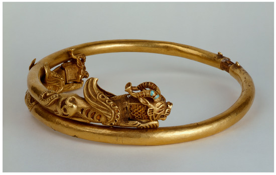 Some of the objects from the Siberian Collection bear the clear imprint of Achaemenid Persian art, and they are marked with similarly specific ornamental motifs. The most splendid and typical one is a gold torc with open ends terminating in lion griffins (Figure 4). This type of monster is similar in style to the Iranian images and similar to the murals of Susa. The treatment of the cloisonné technique is exactly like that of a gold armlet from the Oxus Treasure. This fact was doubtless noticed by O. M. Dalton (Dalton 1964, pp. 52–53). He concluded that the two ornaments should have been considered synchronous and closely related. He supposed that the torc travelled north from the Persian border, perhaps from Bactria, or that a craftsman from the south, migrating to Siberia, there carried on his tradition. Polychrome incrustation executed in technique cloisonné which is typical of Persian art should be considered a sign of the Iranian origin of the object or of the craftsman who has created the piece of jewelry, or, at least, of an artistic tradition migration. Yet the question is of the provenance of the objects. Indeed, it becomes even more complicated.
