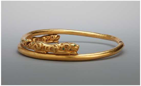 Polychrome incrustation in jewelry is an evident feature of the Achaemenid culture. Yet it derives from earlier epochs and cultures of the ancient East. There is a reason to believe that the technique commonly described as orfèvrerie cloisonné, originated in the Nearer East. Initially, it was very typical to Egyptian and Phoenician applied art as well as to Assyrian art of the 9th–8th centuries BC, a culture also rich in cloisonné technique. Its great development took place in Achaemenid Persia. Then from Assyria and Persia, this type of art entered the Scythian world and the region of the Oxus treasure. The monsters of the Iranian world look similar to winged creatures with goat horns and beaked eagle heads, or lion-headed hybrid animals with lion or ungulate bodies. Such hybrid figures decorate the ends of the Hermitage torc (Figure 4. State Hermitage, Z-568). The closest parallel to this torc in style and technique is a pair of bracelets from the Oxus treasure (BM ANE 124017, Victoria and Albert Museum, 442–1884). These jewelry pieces belonged to the Iranian workshop of a “royal circle”, in spite of the opinion of some who derive this collar from the Siberian art influenced by Achaemenid jewelry (Rudenko 1962, pp. 18–19). Yet, different scholars had different views on the provenance of this torc and derived it from Eastern Iran, as well as the next object (Ivanov et al. 1984, cat. 2, 3). Another golden spiral torc from the Siberian Collection (Figure 5, State Hermitage, Si 1727 1/62), with open ends terminating in feline beasts of prey (perhaps, tigers) demonstrates a very similar style and similar decoration technique, with inlays but without cloisonné. This gold torc from the Peter the Great Collection is probably dated from the 4th–3rd century B.C.