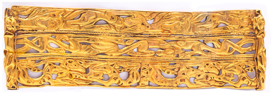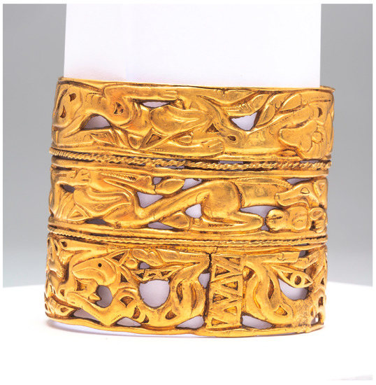 There is another golden object that could be included in this stylistic group. This is a wide bracelet from the Siberian collection of Peter the Great (Figure 6 and Figure 7. State Hermitage, Si 1727 1/68), which is the only item of this category of jewelry in the collection of this type of bracelet. It represents a rare type of armlet with a multi-component structure. It consists of three open-work friezes with zoomorphic compositions in an animal style similar to the above-mentioned stylistic group, related to Iranian culture. All three parts of the bracelet are created in a common style, but obviously in different individual manners. There is no doubt that the zoomorphic images show three different authors’ hands, and that the parts of the bracelet were made by different goldsmiths. Thus there is evidence of collective work on the object, during which each artisan creates their own method of creating a unique jewel at a workshop. This could be explained, for example, by a lack of time, as in the case of working on items for a funeral.