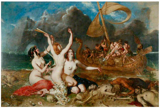 The Sirens and Ulysses by William Etty, circa 1837. Oil on canvas, 297 × 442.5 cm. “Manchester Art Gallery”. This image is in the public domain.