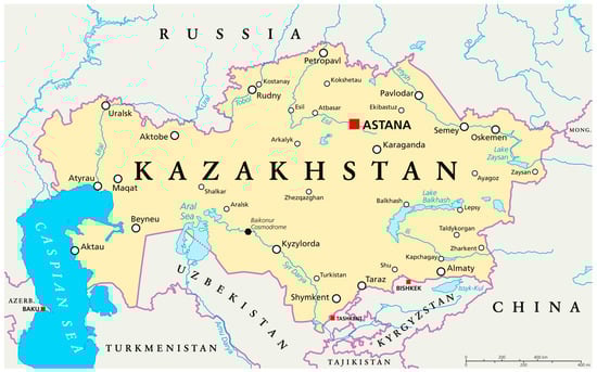 Map of Kazakhstan. Talgar is 25 km east of Almaty.