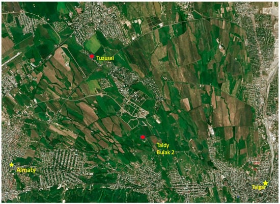 Google Maps image showing the Talgar fan and the location of the two settlements: Tuzusai and Taldy Bulak 2.