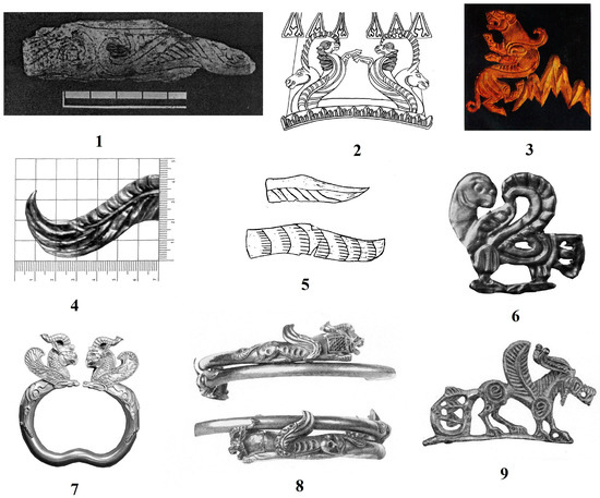 Volute-shaped ornamental motifs resembling the wings of a mythical creature are clearly visible on the plaque. However, due to the fact that the plaque is not intact, the image of this creature is not entirely clear. Examples of similar wing decorations found throughout the Eurasian steppe are presented in Figure 6.