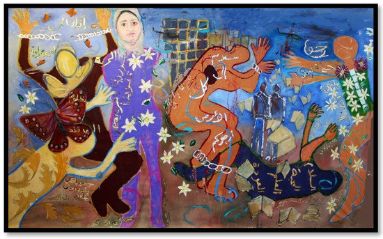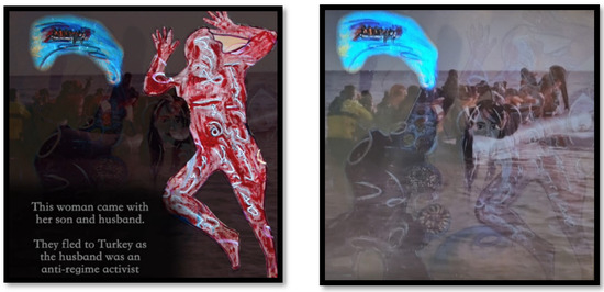 In this context, we argue that it is crucial to adopt creative strategies in refugee studies that evoke contextualization, engagement and understanding of the topics and stories centered around refugees’ biographic memories and lived experiences. For this reason, we introduced an analytical approach that reflects the following aspects that were discussed among the refugees, researchers, as well as artistic production team: first, refugees identified topics that relate to the biographies they want to convey. They made decisions about how to tell their stories on canvas and what imageries to use. Second, we discussed what visual means and techniques to include: zoom, highlights and overlaps to enable viewers to witness refugees’ living experiences that will enable them to view how the stories evolve through the paintings. Third, the production team decided on the audible means—such as noise, sound, music, adhan—whereby a mood is created, and its perception becomes a living experience that allows the viewer to be part of the emotions intrinsic to the narrative.