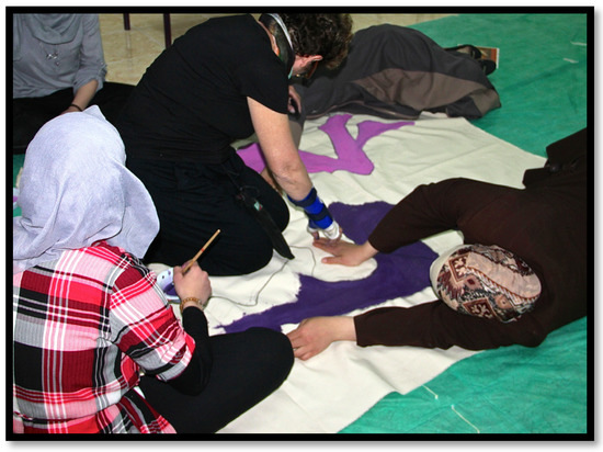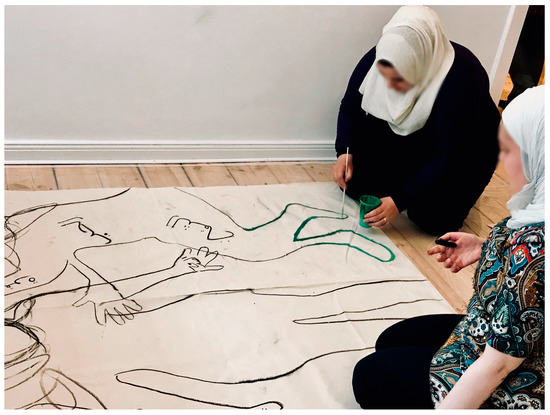 Before introducing the method of body mapping to Syrian refugee women and their families, we conducted ethnographic fieldwork with them in the form of interviews and focus groups. Based on the data collected in the field, we invited the women to participate in the art workshops we organized. At the start, everything seemed to be unfamiliar for the participants as the spaces we usually had our conversations in had changed: plastic covering the floors, paints, brushes and buckets of water, as well as large pieces of canvas spread throughout the space. The idea of laying down on a canvas for someone else to draw the contours of the body was also new to them—although the majority enjoyed being able to reflect on their lives in such a creative way. Body mapping and painting, as an artistic means of expression and as a creative process, offered refugee women a new way of expression and thus opened up novel ways of reproducing lived and felt experiences. The women were able to decide in which position to lay down on the canvas and what elements to use to tell their stories in the form of colors, writings and images. Some participated as individuals, others in groups reflecting and discussing the different ways of expressing themselves through art (see Figure 4).