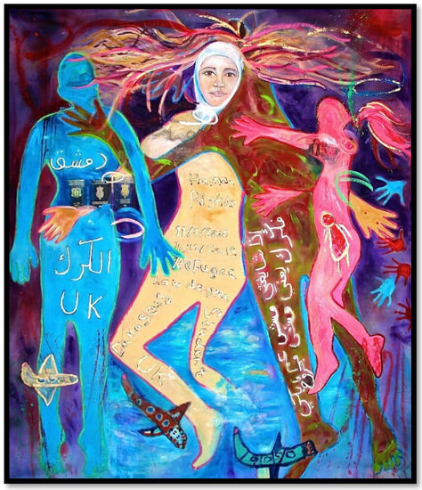 Millions of refugees fleeing war and persecution in Syria have received significant attention in both the public sphere and academic research. This article examines body mapping and augmented reality (AR) as artistic methodological tools that allow refugees to articulate their experiences of forced migration. Body mapping enables the creation of life-sized images which trace the contours of the individual’s body on canvas allowing refugees to express their emotions creatively through their own participation. AR adds another layer to the body map as it animates the artwork and brings it to life. Through body mapping and AR, refugee women from Syria are able to co-create research outcomes and counter gender-biased narratives of vulnerability and victimhood often associated with female Muslim refugees. This project critically engages with the use of art as a sensorialized medium to generate knowledge and examines the impact it shows on viewers during exhibitions. Based on research conducted in the United Kingdom, Germany and Jordan since 2017, this article discusses the use of these new technologies as novel research methodologies in refugee and migration studies.