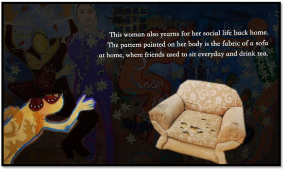 At the start of this article, we cited an interview we conducted with a Syrian woman who yearns for her sofa as it symbolizes her former social life in Syria. This information is not visible on the body map itself. Only through operating the AR, the viewer understands the leaf patterns on the body of the woman in the bottom left corner. These patterns represent the woman’s memory of similar patterns she used to have on the fabric of her sofa in Syria. It is through the mediation of technology that an increase in information on both bodily and emotional levels occurs in the perception of the object. The object, represented through the body of the woman with leaf patterns, is embedded within its particular context, i.e., the sofa, that is yet to be seen through the operation of technology (see Figure 8).
