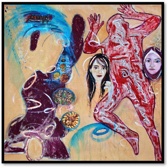 The expressions through postures and gestures, colors and painting style (such as the expression of the brush strokes), the images or symbols as memorial items are linked to the emotional experience of refugees. Thus, the body maps become vessels of visualized items of significance, which are linked to individual memory, experiences and emotions.10 The images have symbolic character, and the imagery creates specific semantics and meanings. The Sisters body map, for example, depicts the refugee journey of four sisters who entered Jordan wearing their traditional Syrian dress (the three sisters on the right). After their arrival in Amman, they felt at home. The feeling of safety and integration is expressed through the sister on the left, who took off her Syrian dress and decided to wear a traditional Jordanian gown. This is supported by words such as ‘security’ and ‘safety’ written on her right arm in Arabic. Each of the sisters also has her own story to tell: the sister in yellow, who entered Jordan with her two sons, is fighting for divorce from her husband, who had returned to Syria and married a second wife.11 The sister in red decided to draw an eye with tears on her body not only to express her pain for the loss of her homeland Syria. The eye is placed on her womb, which sheds tears on the numerous miscarriages she has had to endure over the years, leaving her childless up to this day as she explains: ‘Like me, Mother Syria was unable to protect and keep her children. We both bear the painful scars of losing our children and our loved ones. We share the same grief. We are united in our sorrows and tears.’
