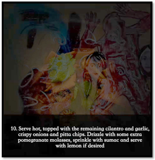 The Cousins body map includes a scan of a food celebration—a picture taken by us during our dinner at the place of the woman in red. Looking at this body map, one would not necessarily expect to see ten steps of cooking instructions which then the AR provides. Parallel to the displacement narrative of the woman in red above, the viewer is introduced to a famous Syrian vegetarian dish called burning fingers (ḥarā’ ’uṣba‘o). The steps illustrated in the AR are all based on the cooking instructions we received during our time with the family in Berlin (see Figure 11).