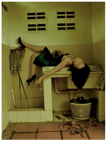 Figure 1, we try to discern every detail of her performance caught in a moment of time that keeps on stretching out to other times and places. In most houses in the Caribbean coast of Colombia there is typically one place that is almost never touched by the women who still employ other women to clean and wash everything in their homes. This is the place where Raisa Galofre is lying with her face erased. It is known as “el lavadero”, the washing place (the scullery), the domain of the lower-class women who serve middle- and upper-class homes. Mops, dried leaves and clothes lie beside and beneath her dressed up female body. It is an image that immediately names an impossibility, because given the way she is dressed, it is obvious she is not the maid, she is not dead, but she is instead playing for the camera, that is, for herself, her gaze.