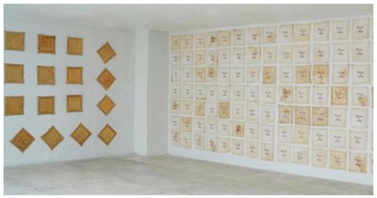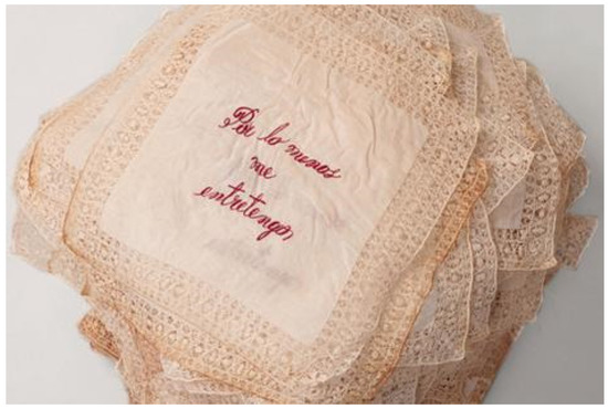 Figure 4, she manipulates and plays with this semantic phrase about the pleasure of work, which points to the “not transcendental” work of women who embroider on a daily basis. She turned evidence of this invisible work into a piece of art that hung at the Museum of Modern Art in Barranquilla in 2011 by commissioning expert embroiderers in Barranquilla to produce 100 handkerchiefs that displayed the embroidered sentence: “At least I entertain myself”. The work honors their labor and refers to the design of a handkerchief that her grandmother used to dry her sweat when she was a girl. Very “feminine” in their style, this installation attests not only the beauty and utility of such objects, but how they put into question the domestic work of women and its invisibility.