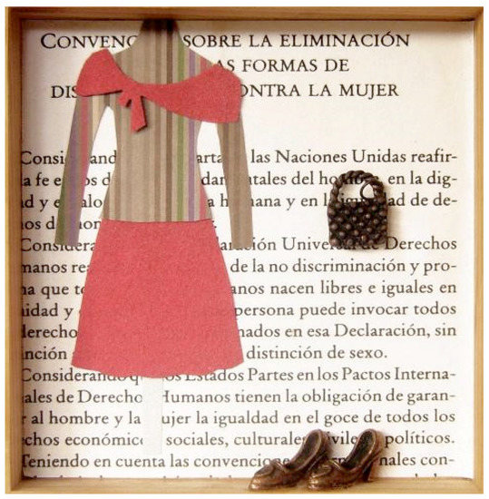 Figure 5, in 2008, sixty years after the United Nations urged the countries that had not declared female suffrage legal to do so. On the back of the box’s interior, a barely readable text discusses the elimination of all forms of discrimination against women, while in front of this are miniature reproductions of fashion items. In putting these two elements together, Gaviria plays with the traditional ways that most cultures accent women’s otherness through clothing as a masquerade via another seemingly banal game. Namely, that those women, who are so pre-occupied with keeping up with the latest trends and seasonal fashion statements, are engaging in a sort of aesthetic play in real time, but one that may prevent them from occupying themselves with changing or improving the status of women in society. The text in the box about the convention for the elimination of all forms of discrimination against women is, thus, obstructed from view by the little cutout dresses, bags and shoes with which girls often play. Behind the fun pretty cutouts, a question emerges: is this what postmodernity is really all about? Culture, like fashion, currently presents itself as at the forefront of a utopian vision of the world, forever renovating and renewing itself in order to obscure the truth of imminent death as the stuff of life. In the midst of a liquid modernity, as