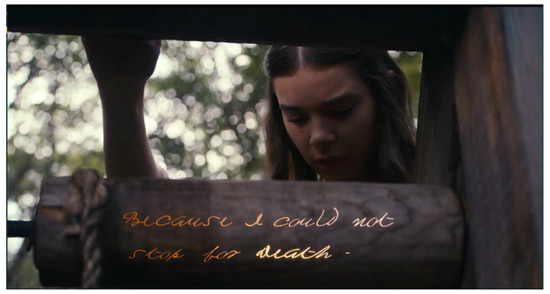 Figure 1). In practical terms, such a combination of animated calligraphy and voiceover aids contemporary audiences who may be unaccustomed to the relatively old-fashioned cursive. The series’ inclusion of lines of poetry in a mixed-media format thus affirms the beauty and artistry of Dickinson’s poetry, while at the same time, its audiovisual representation also parses the poetry for today’s viewers as a kind of less accessible, antiquated high culture.