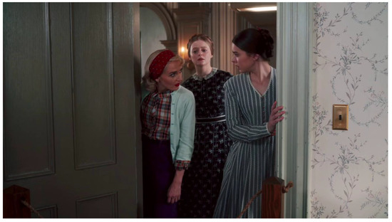Figure 2). This student quickly reveals that she is also a poet: Sylvia Plath (Chloe Fineman). Plath expounds on her fascination for Dickinson and her feeling of “kinship” with the poet, and the sisters are awestruck by the contradictory ways that Emily is remembered. Yet, despite her admiration, Plath also becomes a mouthpiece for the many myths that accrued around her over the hundred years or so since Dickinson’s life, some of which seem suspiciously parallel to Hawthorne’s disdain for women writers: