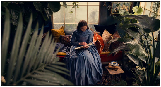 Surrounded by greenery, velvet pillows, blankets, and equipped with a steaming cup of tea, Emily’s reading session looks remarkably like current social media posts by influencers celebrating self-care and bookish retreatism. However, this mise-en-scène revels in an alternative Internet aesthetic: “cottagecore”: “an aestheticized, nostalgic yearning for a life of contained coziness, accented with vases of wildflowers, doilies, long flowing dresses, and delectable desserts” (