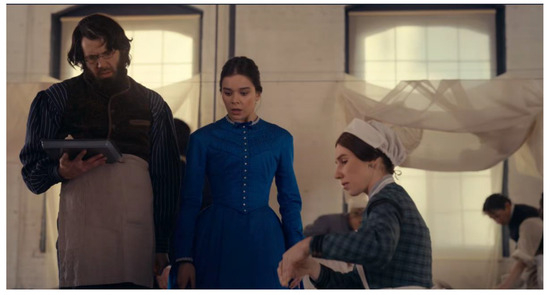 While Emily is following Whitman around the hospital, they encounter yet another literary figure even more sarcastic and pragmatic than Emily in response to Whitman’s ramblings. Again, there is Louisa May Alcott in a return performance by Zosia Mamet. Like Whitman, Alcott too volunteered to serve as a nurse in a field hospital. And in contrast to Whitman, the novelist offers a different take on artistic production. While Whitman treats the injured men around him as an esoteric inspiration, highlighting their cosmic interconnectedness and generalizing from their lives as yet another point in his many lists, Alcott leans into the specificity of their situation. She explicitly expresses her pragmatic writerly motivations: “I get so much great material from doing this […] great fiction is always based in fact, and this place is chock-full of specificity and detail, […] how wounds actually smell bad. Honestly, when some of these guys show up here, it is the vilest odor that has ever assaulted the human nose. It’s kinda gross, but, you know, facts are facts”. Neither Alcott’s obsession with facts and the materiality of the war, nor Whitman’s cosmic connectivity confirm Emily’s suspicion that she needs to experience suffering in order to produce art (