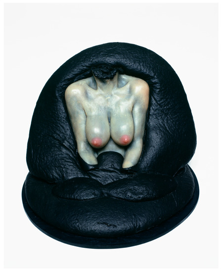 In the sculpture Headless Torso (Figure 2), which Szapocznikow created before her breast cancer diagnosis, a naked, realistic female body sinks into a viscous mass. The head and lower part of the body are engulfed in black material, and the encounter with the work evokes associations of suffocation, sinking, decay, and death. The feeling that emerges from the work is traumatic. Griselda Pollock recognizes that Szapocznikow’s work changed over the years, from being solid and full, with images of a complete and presentable body, to something fluid, amorphous, and disintegrated. This kind of representation of the body, according to Pollock, signifies an encryption of the trauma of the Holocaust, a delayed creative material expression of her experiences in the concentration and extermination camps, about which she rarely wrote or spoke (Pollock 2013). Precisely because of the continued silence, the trauma had to ultimately present itself through traces encrypted in the flesh.