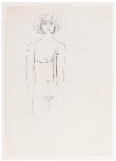 From the moment she fell ill until she died, Szapocznikow underwent many medical procedures and invasive surgeries. In one of her self-portraits, she depicted her body after a mastectomy (Figure 3). In it, she stands naked, gazing fiercely at the viewer. Her mastectomy scar stretches from her shoulder to her navel, and the breast that remains takes up almost her entire chest.