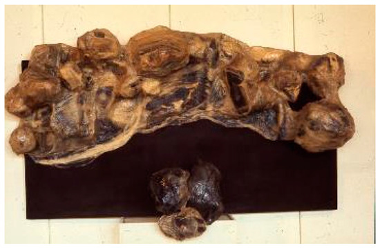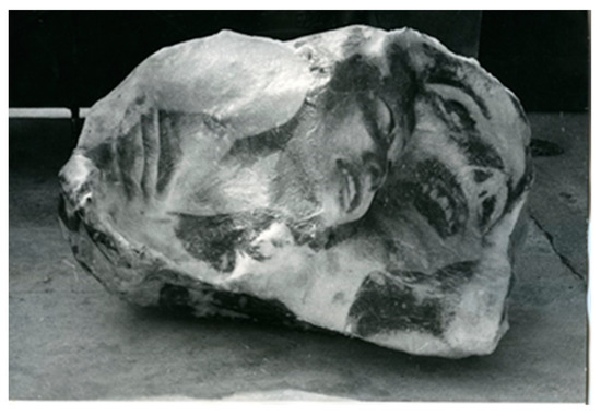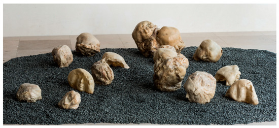 The disease is one of the means by which to voice the memory of the Holocaust and transmit it to future generations. The body speaks covertly, in a way that culture cannot control, as literary scholar Talila Kosh Zohar explains, and the disease of the female survivor’s body serves as a language through which memory is transmitted (Kosh Zohar 2013, p. 275). In the installation Tumors Personified (Figure 5), Szapocznikow’s face is cast onto a large number of tumors scattered over a surface that resembles bare soil. It seems that the faces are growing out of the tumors or that the tumors are enveloping and digesting them. The fragmentation evokes a feeling of suffering, and the humanized tumors are reproduced and spread over the earthy surface like metastases multiplying uncontrollably and spreading through a body. At the same time, they recall the appearance of a mass grave, which evokes not only the artist’s death but also mass death, the extermination of a people.