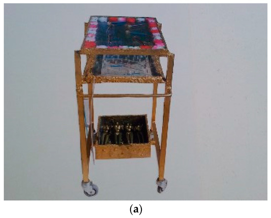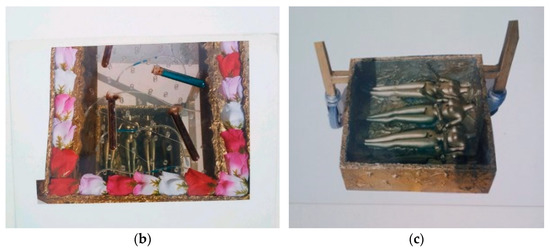 In 1993, Massad was diagnosed with breast cancer. About a year later, she created a sculpture—a wheeled cart with shelves painted in gold (Figure 7a). The upper shelf in the cart is cast in oil, and colorful silk flowers are pressed into it (Figure 7b). On it are four test tubes. One is filled with a bluish liquid reminiscent of antiseptic or liquid medicine, and the others are filled with the artist’s hair and the hair of other women collected by her. The middle shelf is wrapped in foil, and on it are glued plastic tubes of the kind used for IV drug administration. On the bottom shelf lie four decapitated Barbie dolls covered in gold in a box, as if in a mass grave (Figure 7c).