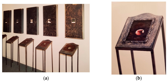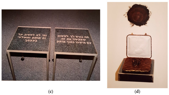 In 1996, Massad continued to develop this theme in the multi-piece installation, For the Purpose of the Plot (Figure 8a–d). The installation, a kind of memory puzzle (Gonen 1996), included collages hung on a wall and iron podiums on which were placed a board with a photograph Massad took of the inside of her body or a text surrounded by hair (Figure 8a,b), several carts on wheels holding marble slabs with engraved texts reminiscent of tombstones in a Jewish cemetery (Figure 8c), and scraps of paper on which were drawn random images such as an axe, a shoe, a fish, a body, and a suitcase. In addition, there was a jewelry box containing a small statue simulating an unidentified body part, and above it, a round rug with hair glued onto it (Figure 8d).